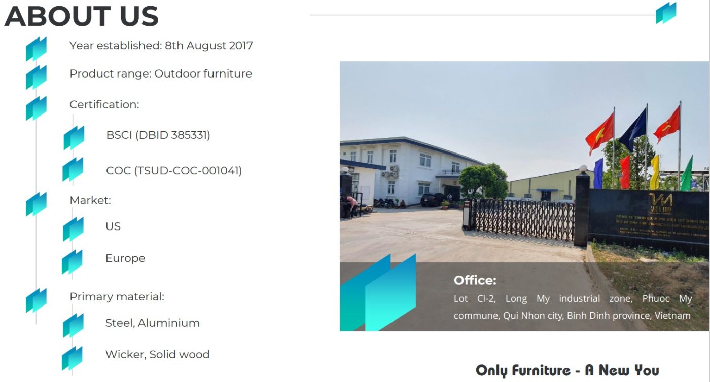 We work towards a vision that was created for the bliss of souls like mine. By placing similar responsible business practices at the center of what we do, we promote progressive and innovative mindset while consistently deliver high quality products and services to our customers. Through these efforts, Viet My Binh Dinh brings creating a sustainable future worthy in Outdoor Furniture Industry. We hope that our efforts will continue to inspire changes in the industry.